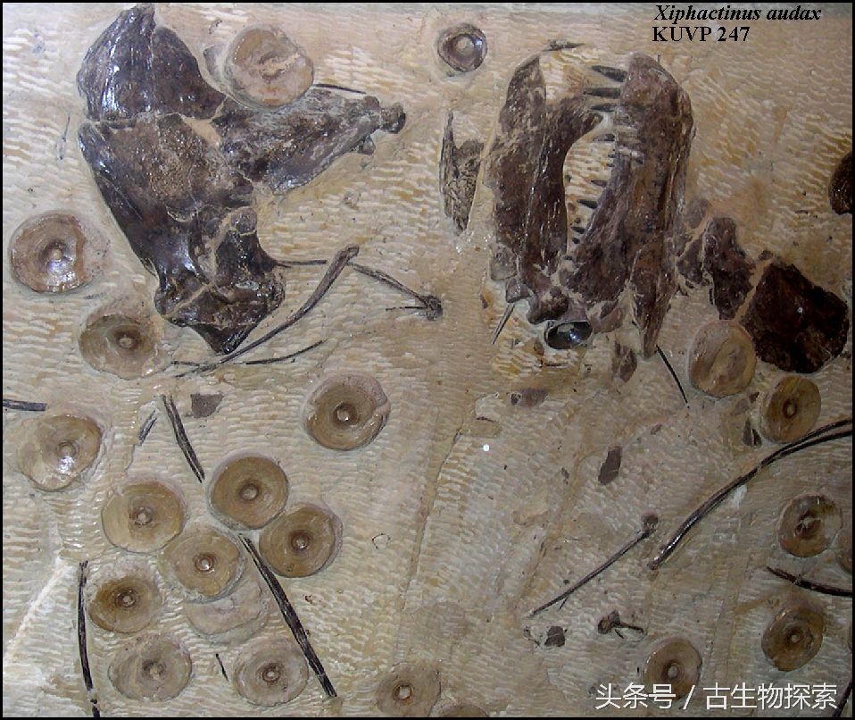 图注:编号为KWP 247的白垩刺甲鲨化石,可以看到在脊椎骨上面有剑射鱼的下颌,图片来自网络