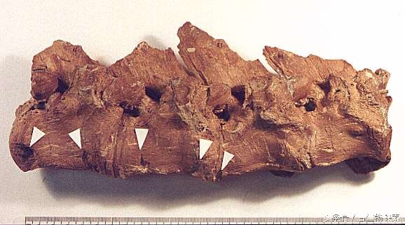 图注:编号为KUVP 1094的板踝龙脊椎骨化石,白色尖头指向白垩刺甲鲨的咬痕,图片来自网络