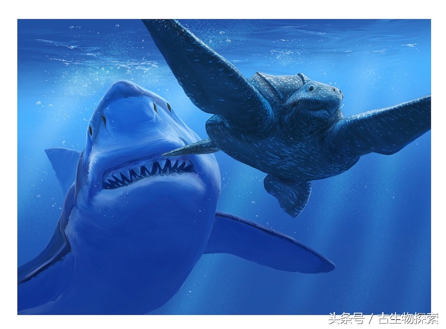 图注:正在攻击古海龟的白垩刺甲鲨,图片来自网络