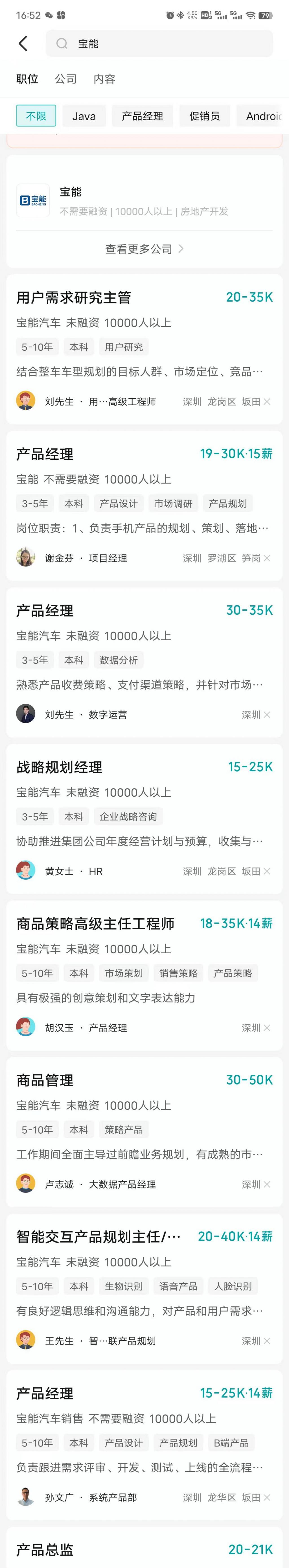 不过,记者确实在第三方招聘平台上发现,宝能汽车在西安、深圳区域,有多条招聘信息,岗位包括用户需求研究主管、产品经理、战略规划经理、大数据开发工程师等,给出的薪资在 15k~50k 不等。" 新人刚进来(宝能)的时候工资都会很不错,公司的考核也会很严格。" 不愿具名的前宝能系人士李山(化名)表示。