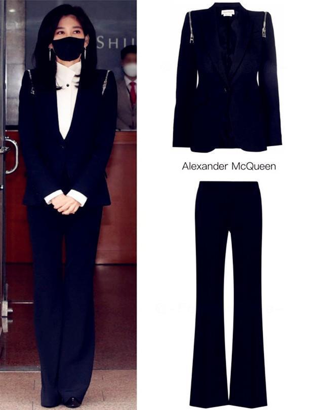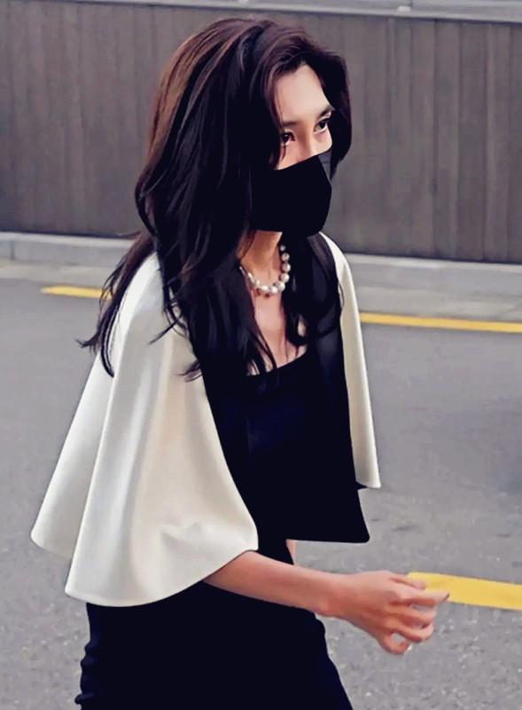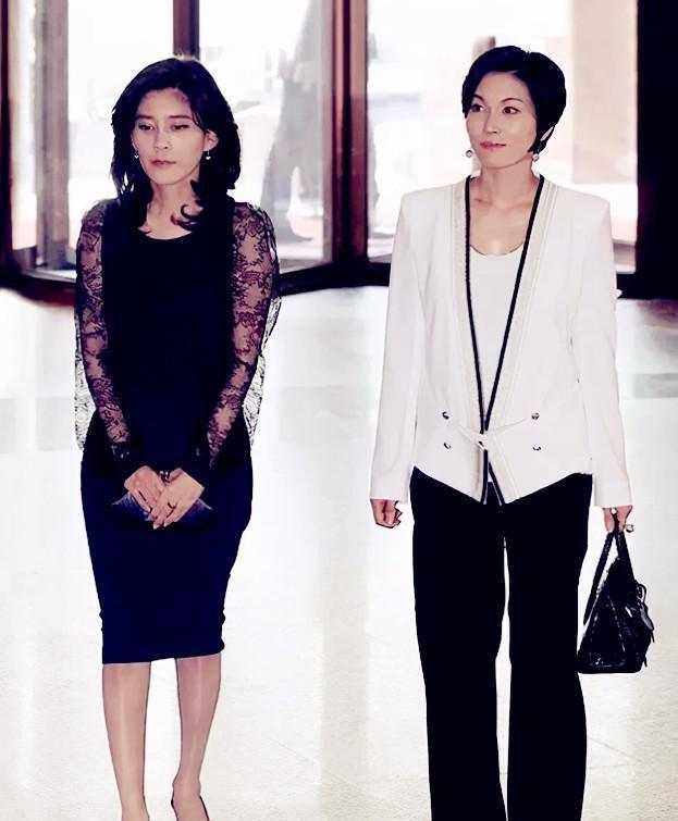 李富真穿着高定版的Alexander McQueen(亚历山大·麦昆),整体以黑色的西装套装和白色的衬衫为主,但是“霸道公主”的三分冷漠和七分冷艳却是藏不住的,漫不经心的美,从不屑的眼神中流出,形成高贵而独特的气质。