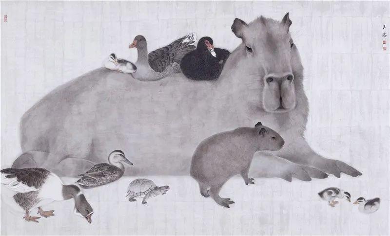 创作时甚至把物象作夸张处理,如《无忧之地》作品中把水豚的真实体型放大,像一艘诺亚方舟的模样,背上载着可爱的小动物们一起渡河。作品有趣且让观者心生欢喜。