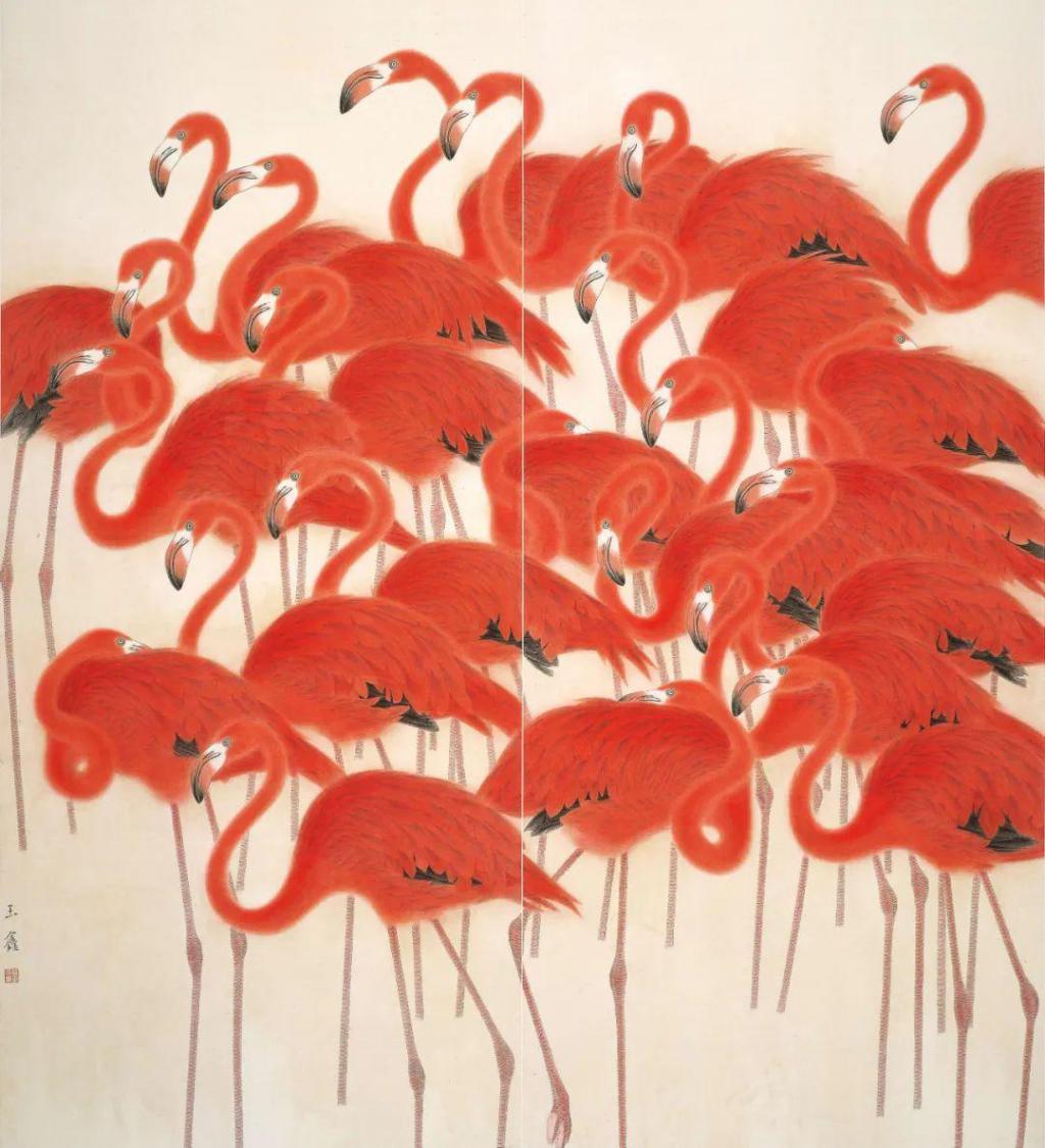 如入选第十一届全国美展的《红云》,画面没有配景,重重叠叠的火烈鸟只有黑、白、红三种纯粹的颜色,使画面具有很强的视觉冲击。