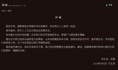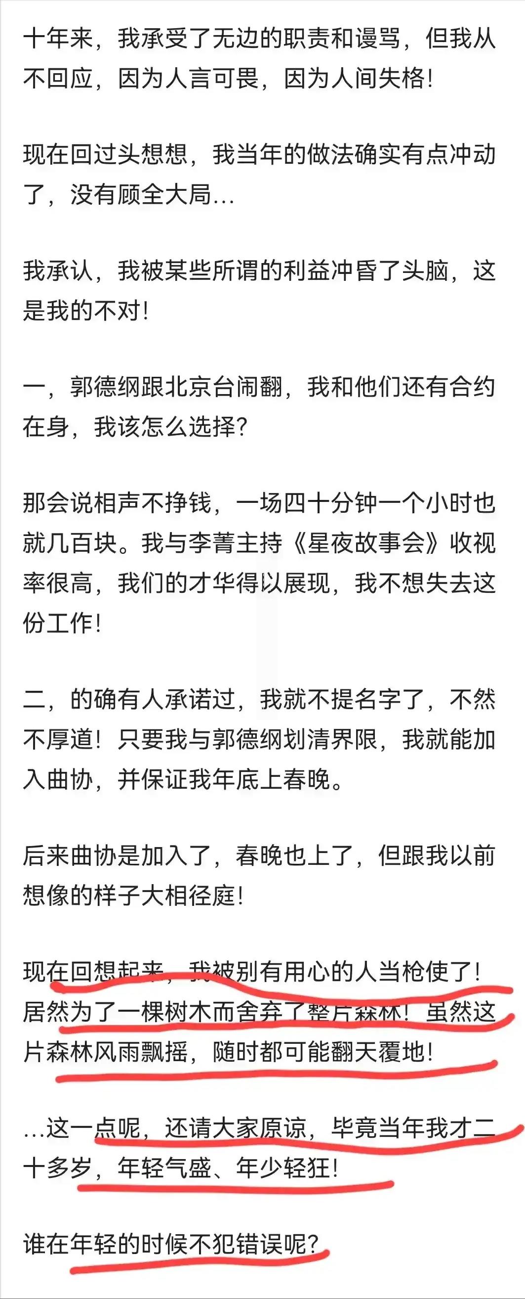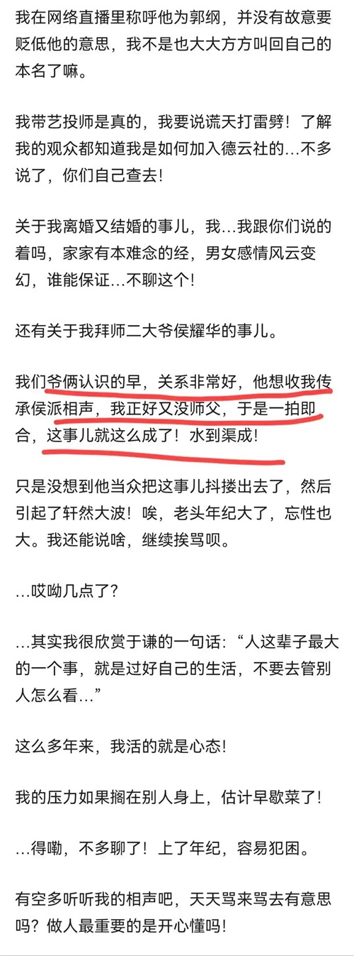 如今看来,何云伟退出还有其他外力原因,有人承诺他与郭德纲划清界线,就可以上春晚,入曲协。所以当时的他做出这个决定,是内外因素都有,一个20岁的小孩,面对这种问题,也不能全怪他,试想这事发生在你我身上,我们也会纠结。大家可以看下面何云伟自己是怎么说的,一目了然。至此,事情还没发展到师徒反目,此事的老郭可能也就是伤心失望,还谈不上恨。所以他的云字此时并没有收回。在老郭看来,当时的何云伟也只是一个为了前途退出的懵懂少年而已,徒弟要奔大好前程,师父也无话可说。