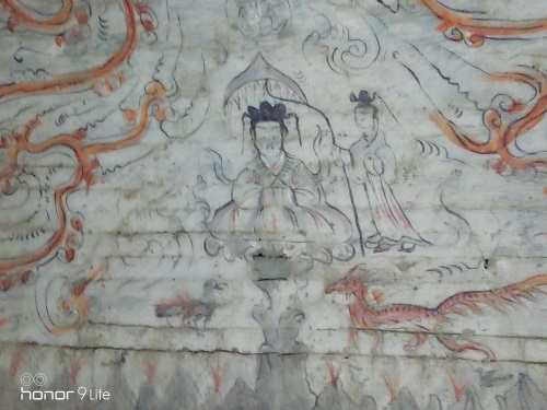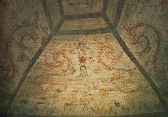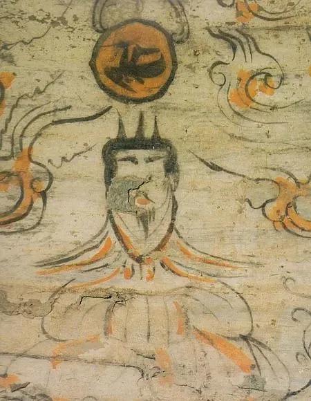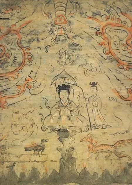酒泉丁家闸五号壁画墓前室东壁,东王公袖手盘坐在扶桑树上,头顶一轮红日,内绘一展翅金乌。西壁上西王母雍容华贵,端坐于若木树上,一侧侍童打着流苏华盖头顶盈月内绘一白色蟾蜍,座前九尾狐、三足乌静静等候差遣。