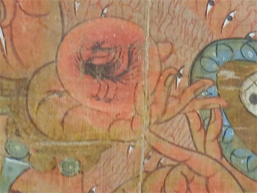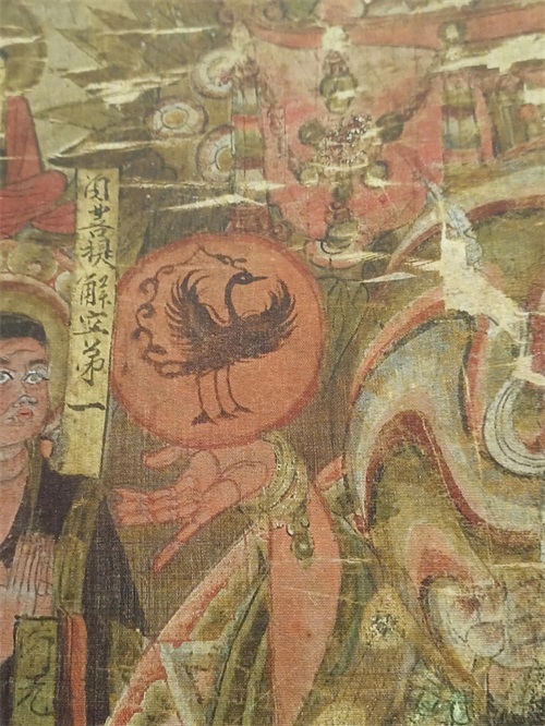 形象二,佛教文化千手千眼观音像左手中代表的三足乌。在佛教文化中三足金乌也多次出现。在流失海外的敦煌绘画中,千变观音菩萨像左手一圆圈内显三足金乌,右手一圆圈内显桂花树,玉兔捣药,蟾蜍的等形象的图。笔调细腻生动,线条优美自然,色泽均匀生动,乌鸦翩然展翅,三足细长优美,脖颈高贵典雅,头部微微抬起,表现出肃穆庄重的气韵。有的图在右手,有的图出现在左手,分别代表太阳和月亮。这与民间传说的月宫,桂花树不谋而合。中国佛教文化博大精深。既有外来文化的吸收,又有土生土长的地方民族文化继承,有的地方还和道教文化兼容并用,进行了融合。更为巧合的是在丁家闸五号壁画墓中,三足金乌和蟾蜍也出现在西王母的画像中,都是作为信使出现的。可见,宗教文化和民族传统文化有许多相同之处,包容兼并,在某些方面有着共同的渊源和文化基础。