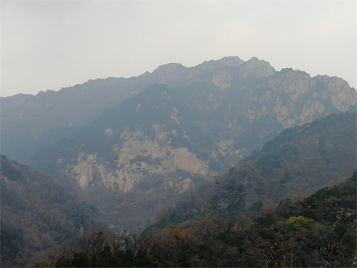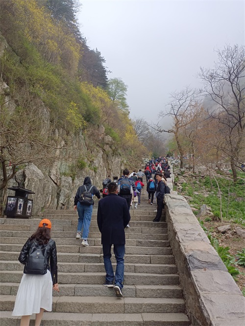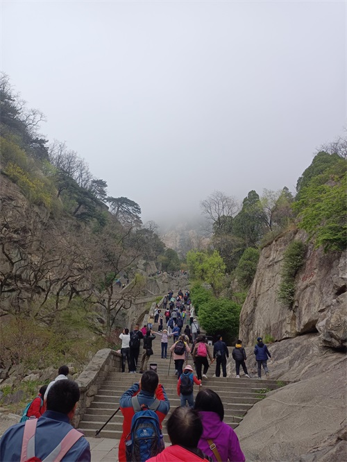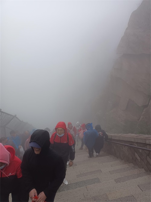 这次来与上次有所不同,上次来带着新鲜感,这次荡然无存,路两边的风景我竟然忘记了,只记得到了山上的树叶才刚刚长出嫩芽,在寒风的威逼下,摇摇欲晃,随时都可能掉下来。到了山路十八弯,雾气越来越大,前后几米已经看不见人,脚步越来越沉重,每走一个台阶仿佛都在耗尽身体的最后力量,大腿开始疼痛,肌肉的拉伤感好像刺痛了每一个神经。同事说:“不行了,找个地方休息休息吧!”我们来到一处平台,吃了个苹果,补充下能量,顺便休息下疲倦的身体。