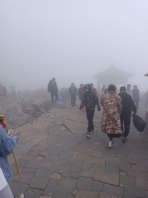 吃过饭后,身体终于暖和一点,我们又继续往上走去,之前我来过一次,大概记得路怎么走,穿越了天街,孔子庙,终于来到了泰山的山顶玉皇顶。由于雾气太大,什么也看不清楚,我和同事拍了几张照片就冲冲离去。