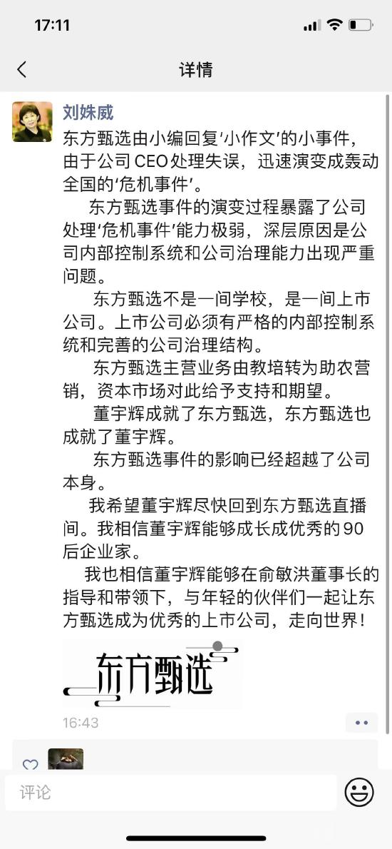 著名财经学者、中央财经大学中国企业研究中心研究员刘姝威也在个人社交平台分享了自己的观点,并指出东方甄选在内控和治理上出现了严重问题。她表示:"东方甄选由小编回复‘小作文’的小事件,由于公司 CEO 处理失误,迅速演变成轰动全国的‘危机事件’。事件的演变过程暴露了公司处理‘危机事件’能力极弱,深层原因是公司内部控制系统和公司治理能力出现严重问题。"