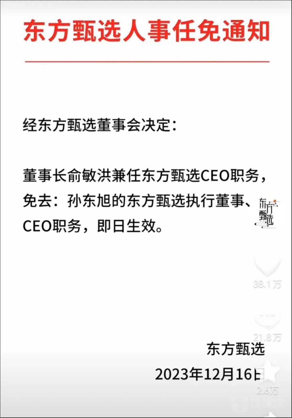 12 月 16 日,东方甄选(01797.HK)在其官方账号发布消息称,经东方甄选董事会决定,董事长俞敏洪兼任东方甄选CEO 职务,免去孙东旭的东方甄选执行董事、CEO 职务,即日生效。