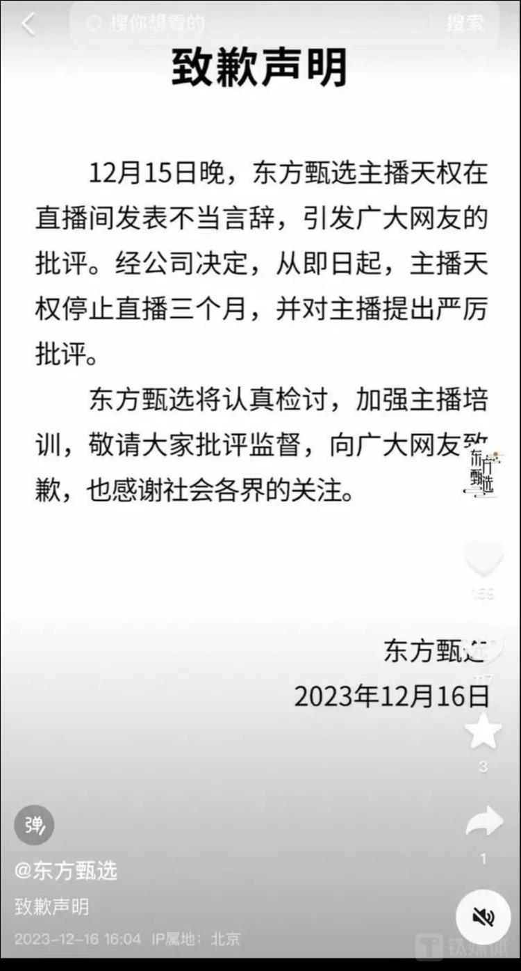 另外,同在 12 月 16 日,东方甄选还曾发布一则致歉声明称:12 月 15 日晚,东方甄选主播天权在直播间发表不当言辞,引发广大网友的批评。经公司决定,从即日起,主播天权停止直播三个月,并对主播提出严厉批评。东方甄选将认真检讨,加强主播培训,敬请大家批评监督,向广大网友致听歉,也感谢社会各界的关注。