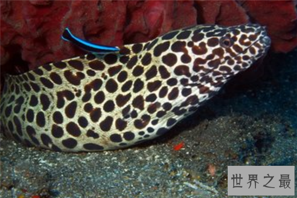 海鳝,它生活的区域主要在热带和亚热带海洋,分布于浅水区域,它的鳃孔小而圆,并且没有胸鳍,表皮十分光滑,也没有鱼鳞,它的牙齿非常的坚利,是它们捕捉食物的利器。