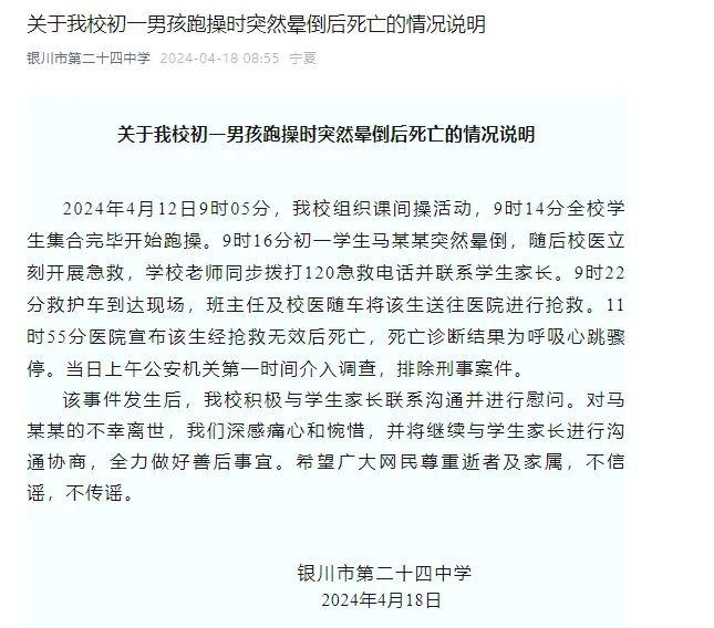 4 月 18 日,宁夏银川市第二十四中学发布关于我校初一男孩跑操时突然晕倒后死亡的情况说明,全文如下: