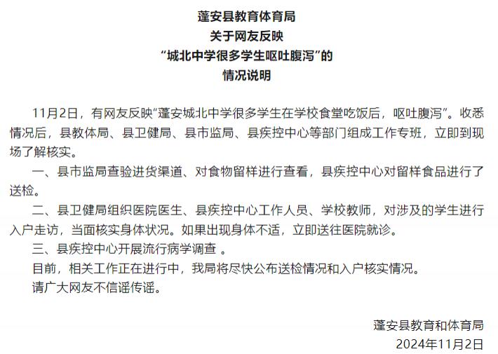 11 月 2 日,有网友反映 " 蓬安城北中学很多学生在学校食堂吃饭后,呕吐腹泻 "。收悉情况后,县教体局、县卫健局、县市监局、县疾控中心等部门组成工作专班,立即到现场了解核实。