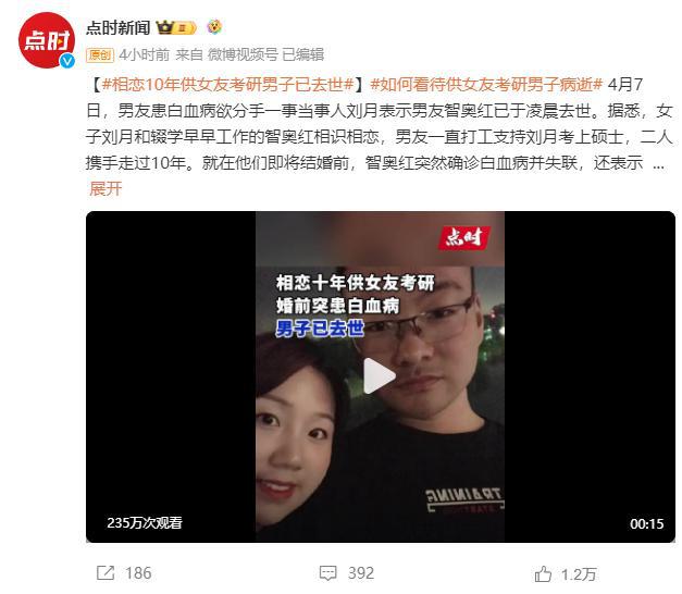 4 月 7 日,男友患白血病欲分手一事当事人刘月表示男友智奥红已于凌晨去世。