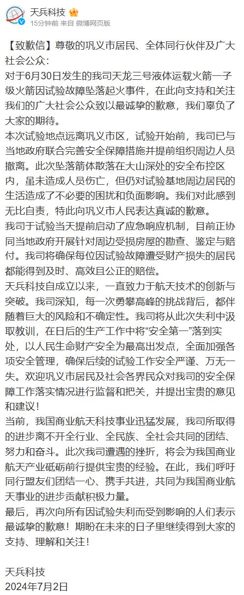 ZAKER 科技 7 月 2 日消息,天兵科技 7 月 2 日发布致歉信,对于 6 月 30 日天龙三号液体运载火箭一子级火箭因试验故障坠落起火事件,向社会公众致歉。