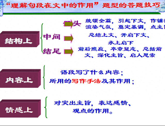 九年义务教育初中《语文教学大纲》中对现代文阅读考查的其中一个方面就是:结合具体的语言环境揣摩词语和句子的含义和作用。怎样理解文章中关键词句的含义和作用在现代文阅读中,若能正确理解和分析这些词句,有助于把握文意和全文的主旨。那么,怎样理解文章中关键词句的含义和作用呢?