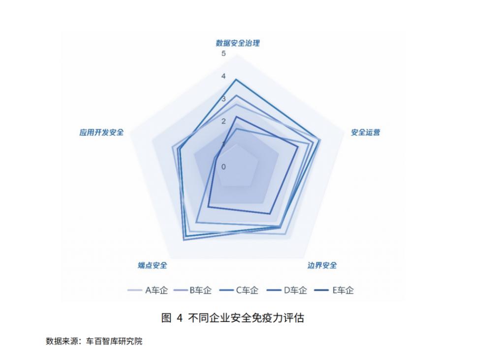 腾讯云安全总经理李滨认为,对数据的保护应该是企业所有安全工作的价值原点,而要实现数据的保护,车企需要从边界、端点、应用开发、安全运营、数据安全治理等各个维度建立起全面、主动的数字安全免疫力。《报告》对数家车企对自身在这五个方向上的安全现状做了详细的定量和定性分析,结果显示,车企在车端安全上普遍达到了较高水位,而在数据安全治理(数据分类分级、数据加解密、防泄露等)上则面临较大的挑战。