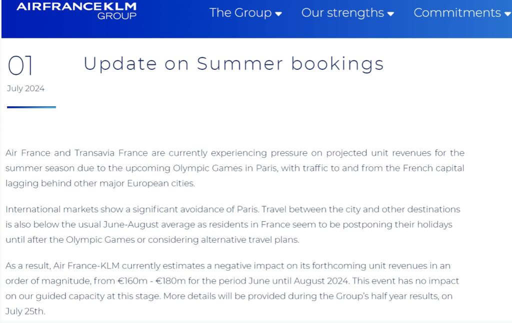 公司在公告中称,为了规避奥运会对巴黎旅游业造成的干扰,以及可能会出现的酒店等涨价潮,国际旅客似乎避开了在今年夏天前往巴黎旅游的计划。数据显示,今年夏天往返法国首都巴黎的航空流量,明显会低于其他欧洲主要城市的数据。