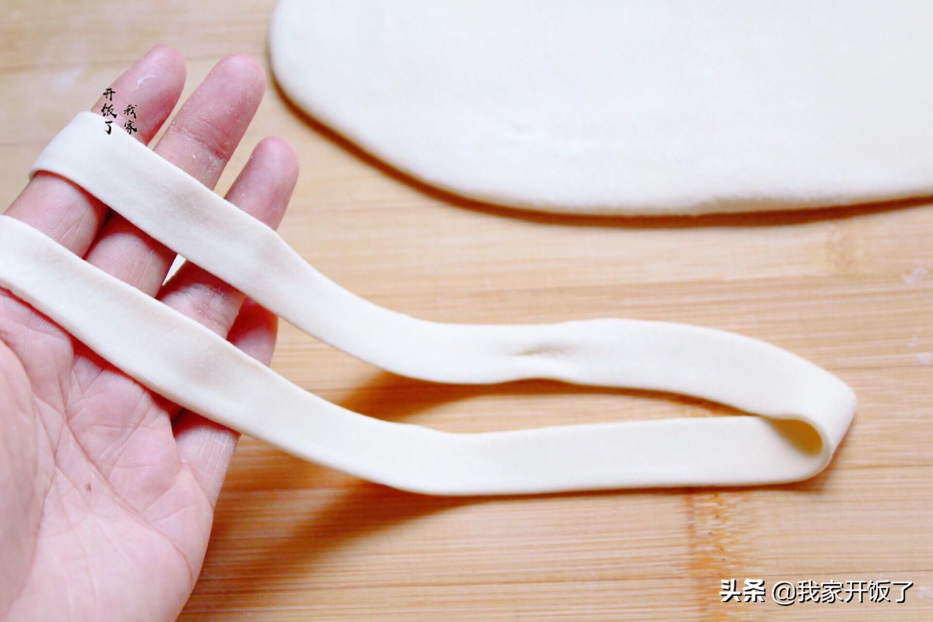 3.擀成两枚硬币的厚度,然后切成宽条。