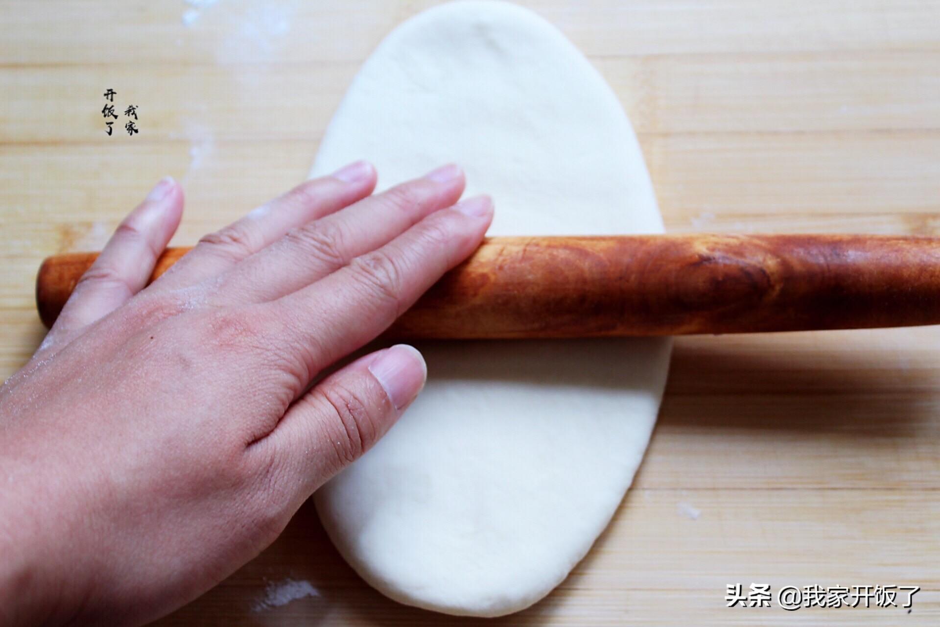 2.面团饧好之后,放在案板上轻揉几下,分成两个或多个面剂子,取其中一个面剂子擀成面饼。(如下图)