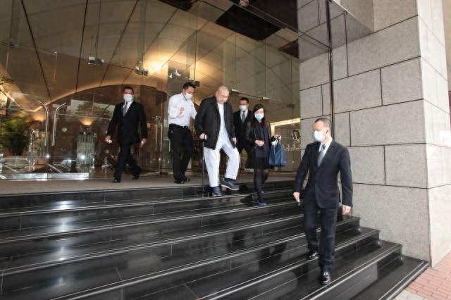 今天刘銮雄出行又被媒体拍到出现华置总部,这次的出行非常的简单没有10个保镖,身边只有1个女助手,4个男士应该是司机和保镖,一行6人。大刘一如既往的穿着浅蓝色睡衣、黑色外套,右手拿着拐杖看起来非常精神没有前面所说精神状态不佳。