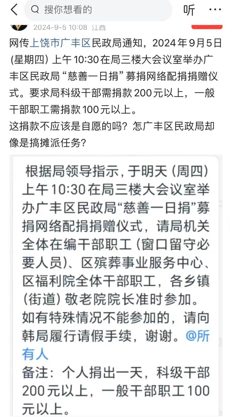 9 月 5 日,有网传消息称江西省广丰区民政局发布通知,要求科级干部捐款 200 元以上,一般干部职工也需 100 元以上捐款,此举在社交媒体上引发关注与讨论。