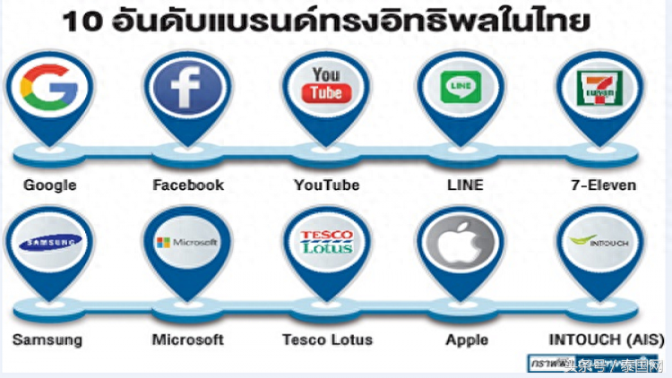 全球领先的市场研究集团益普索(Ipsos)公布了在泰国最具影响力的10大品牌榜单:1.谷歌、2.脸书、3.YouTube、4.LINE、5.7-Eleven、6.三星、7.微软、8.易初莲花、9.苹果、10.INTOUCH (AIS)。