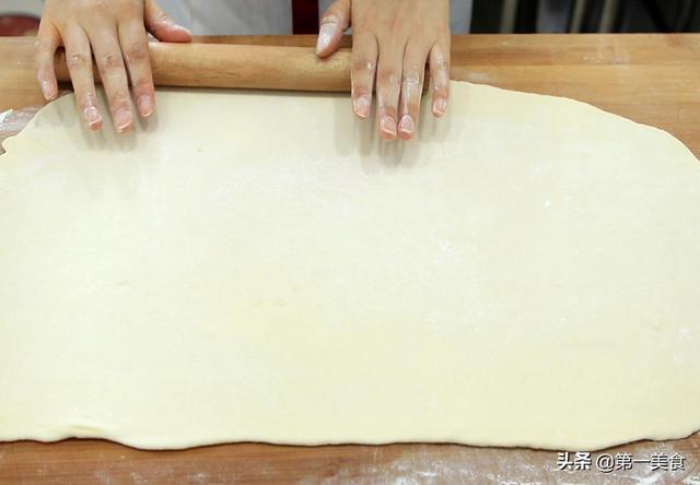 在案板上撒一层面粉,把面团拿出来揉一揉排排气,面团揉简单光滑甜品以后,用手压扁,擀成长方形的面饼。
