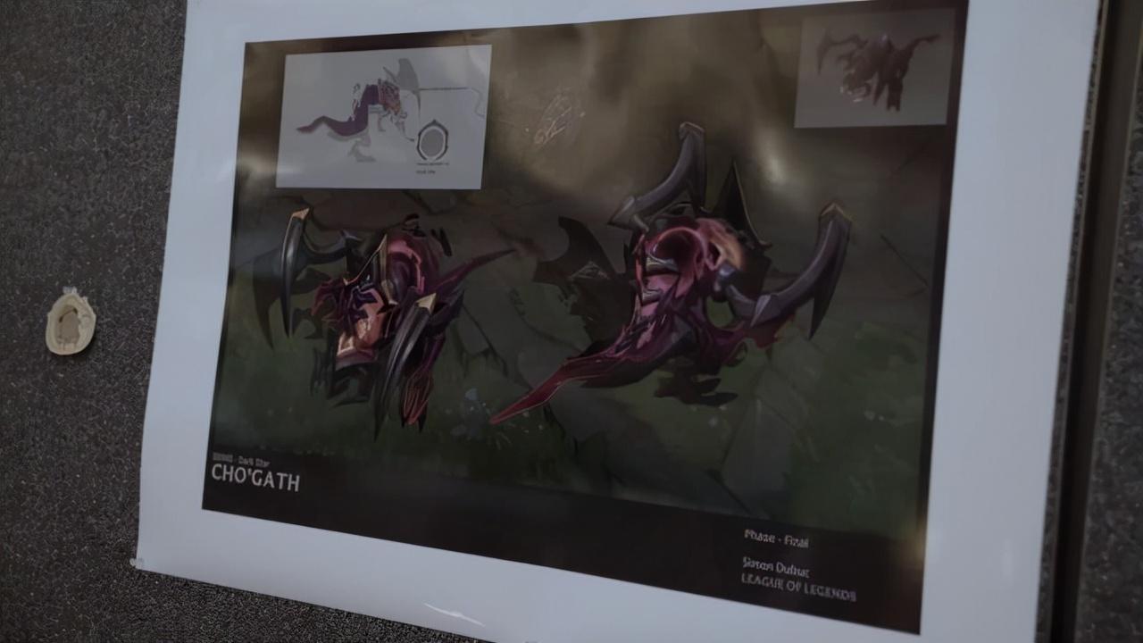 设计过程大概是小男孩BryanBryan和拳头公司透过一连串电邮交流合作,内容是和皮肤的实际开发相关,包括可能的主题 ,一起进行了一场头脑风暴,Bryan尤其喜欢太空星际这类型的主题最终他决定为科加斯选用暗星的皮肤,设计皮肤过程中很酷的一点是Bryan和一名动画师见面,然后他表明了他想要的效果,我猜这些最终都汇入了他的部分动画中,像是回城动画,就是说黑洞从地下冒出,所以他往下挖,把他撕开,开始咆哮,咆哮的同时有其他物体喷出来,然后把他吸了进去。Bryan很喜欢乐队同时也是官宣乐团的乐手,随后他们把Bryan带进了内部的音乐室,Bryan说 如果能带上我的乐器就太好了皮肤团队正在为他制作皮肤,这里也可以为他制作一段模拟的登录音乐,所以科加斯的皮肤制作内容与声效之制作Bryan都参与了其中。