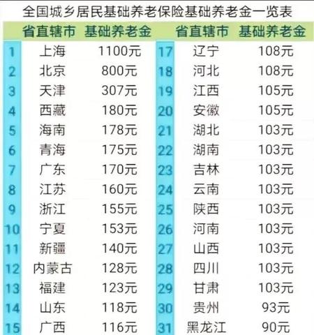2025年全国31省市,“国家基础养老金”发放标准如下表: