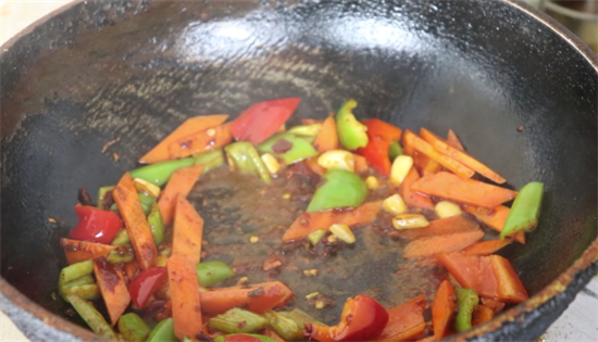 4、起锅烧油,油的量和平时炒菜的量一样就可以了,放入大蒜片爆香,大蒜片炒出香味之后,再加入适量的豆瓣酱,翻炒均匀之后加入青红辣椒和胡萝卜片翻炒,翻炒均匀之后就可以开始调味了,加入适量的生抽,食用盐,白糖,蚝油用大火翻炒两分钟,两分钟之后放入花菜继续翻炒,翻炒大概两分钟就可以了。两分钟之后就可以关火装盘了,装盘之后就可以享受美味了。一道非常美味的花菜炒青红椒就这样做好了,做法是不是非常简单呀?你喜欢这道花菜炒青红椒的做法吗?如果你也喜欢的话,那就抓紧时间准备食材,亲自动手尝试一下吧。