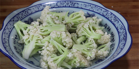 1、首先准备适量的花菜,花菜清洗干净之后用刀切成小瓣,切完之后先放到一个碗中。然后加入适量的清水,清水没过花菜就可以了,然后加入适量的食用盐,先用手抓拌均匀,然后浸泡10分钟。