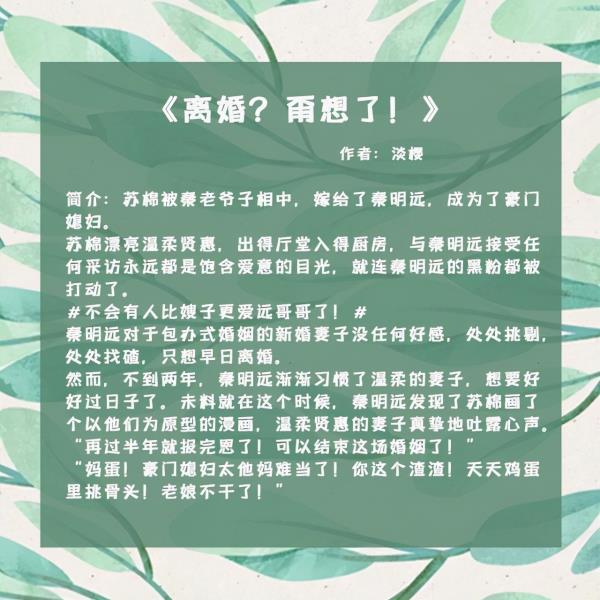 短书评:秦明远在家里的安排下,被迫娶了联姻对象苏棉。秦明远不满家里的安排,对新婚妻子百般挑剔,未料苏棉温柔以待,时间一久,秦明远喜欢上了苏棉。而就在这个时候,秦明远却意外发现苏棉画的漫画。漫画里的苏棉真挚地吐露心声,表明了一切都只是为了报恩,对他毫无爱意。秦明远深受打击,同时也开始了追妻之路。本文轻松搞笑,主角配角都刻画生动,主人公之间的感情与经历在作者温柔的笔触下娓娓道来,展现出一个丰富精彩动人的故事,值得一阅。