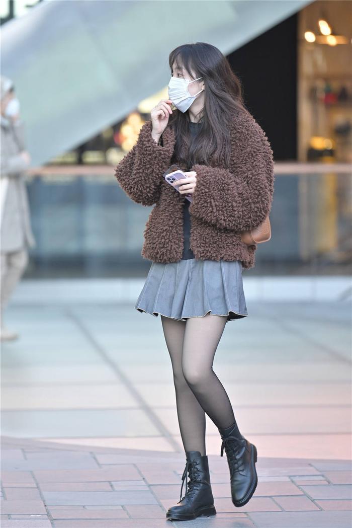 选择自己喜欢大风格,搭配出简约时尚的感觉,生活要有点不一样,这位美女选择搭配,就很有特点,黑色丝袜比较薄的款式,搭配系带马丁短靴,很简单的搭配,灰色的百褶裙,衬托身材,也显出小女生的味道,外面是一件褐色的短款外套,抓绒风格设计,有点仿皮草的效果,很厚实,保暖效果很好,冬季穿着保暖时尚。