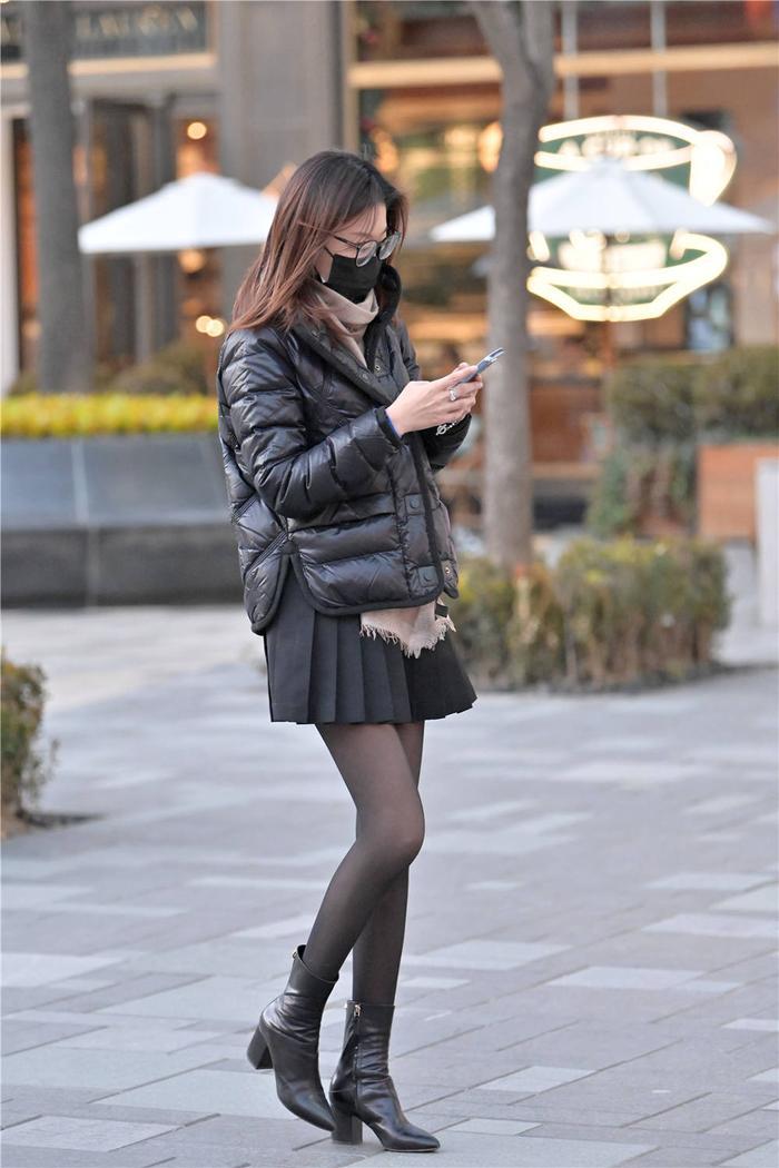 到了冬天,很多人还是希望自己搭配出显瘦的效果,不希望自己的穿搭看起来比较臃肿,很多美女会展示纤细长腿,所以搭配也会有不一样的感觉,很多人还是会喜欢搭配黑色丝袜,增加一点神秘,也起到显瘦的作用,这位美女选择黑色丝袜,比较厚实设计,保暖效果也不错,搭配一双黑色的短靴,粗跟设计,不是很高,却显得很优雅,也非常有质感,黑色的百褶裙,也是很精致的设计,黑色短款羽绒服,保暖效果很不错。
