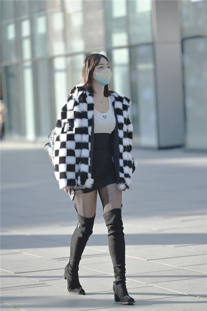 看到别人的搭配,要了解自己风格怎么样,时尚美女会选择一些精致的服装来衬托自己,这位美女选择一款黑色丝袜,非常好看,搭配一款黑色过膝长靴,修身款式,衬托身材效果很好,粗跟设计,不是很高,很多女生都会喜欢这一款,一款黑色高腰裙,搭配白色运动风衬衣,一款黑白色棋盘格的皮草外套,增加层次感,也显得很特别,穿搭是为了更好展示自己,看起来比较简单,却非常有层次感。