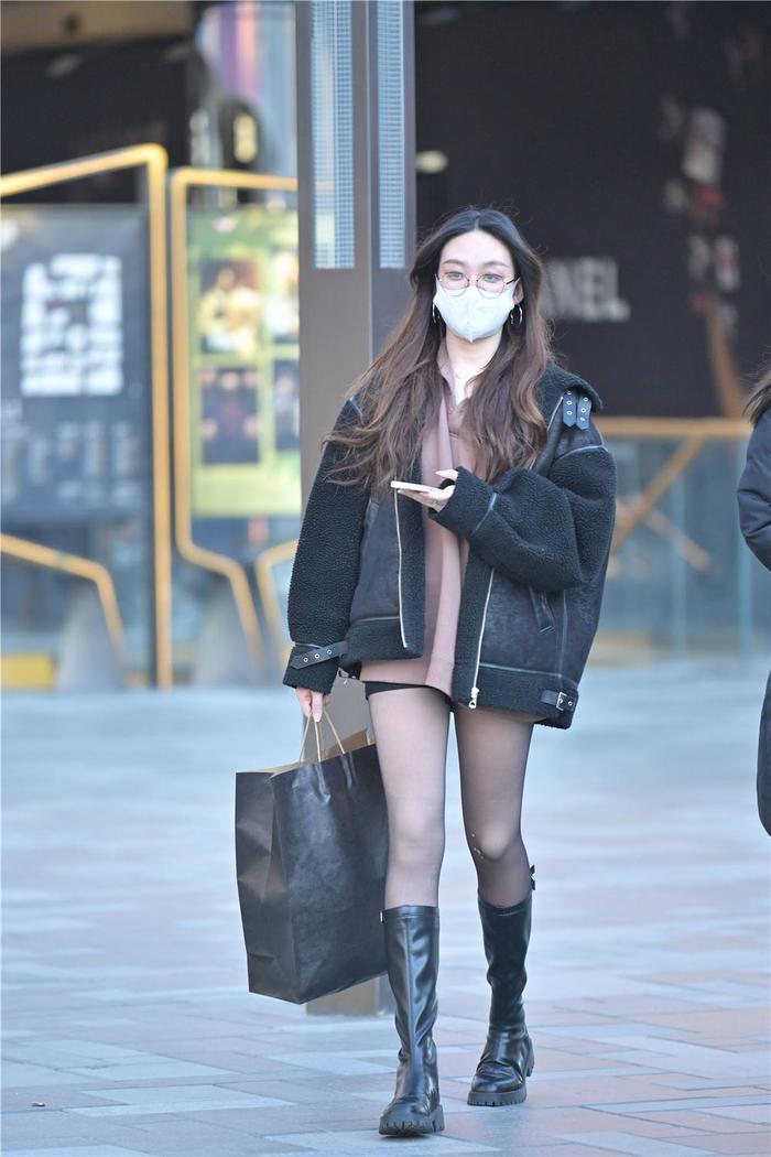 时尚美女,了解自己该如何搭配,也会选择一些比较特别的风格,这位美女选择黑色丝袜来搭配,比较薄的款式,搭配一双高筒靴,厚底马丁靴设计,非常简单,也是很独特的感觉,穿搭就是为了自己更美一些,一款暖色的衬衣,搭配在里面,简约的风,外面是一款棉服,夹克风格的设计,比较厚实,保暖效果也很好,而且黑色也是比较常见的冬季搭配,穿出小女生的味道。