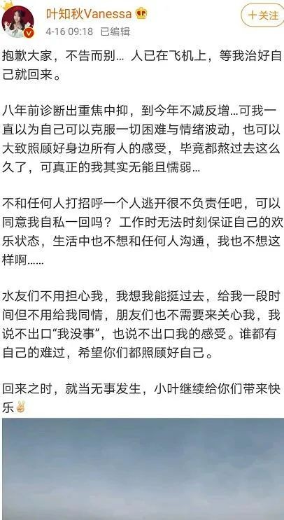 正当事业蒸蒸日上,大家也对她的直播间前景一片叫好之际,叶知秋却在今早突然现身wb发文跟水致歉,让水友原谅自己不辞而别,希望水友可以同意她自私一次!博文中,叶知秋表示自己有重度焦虑症和中度抑郁症,并且今年开始不减反增,本以为能克服一切困难和情绪波动,并且照顾好身边所有人的感受,但是实际做下来才发现自己是无能和懦弱。