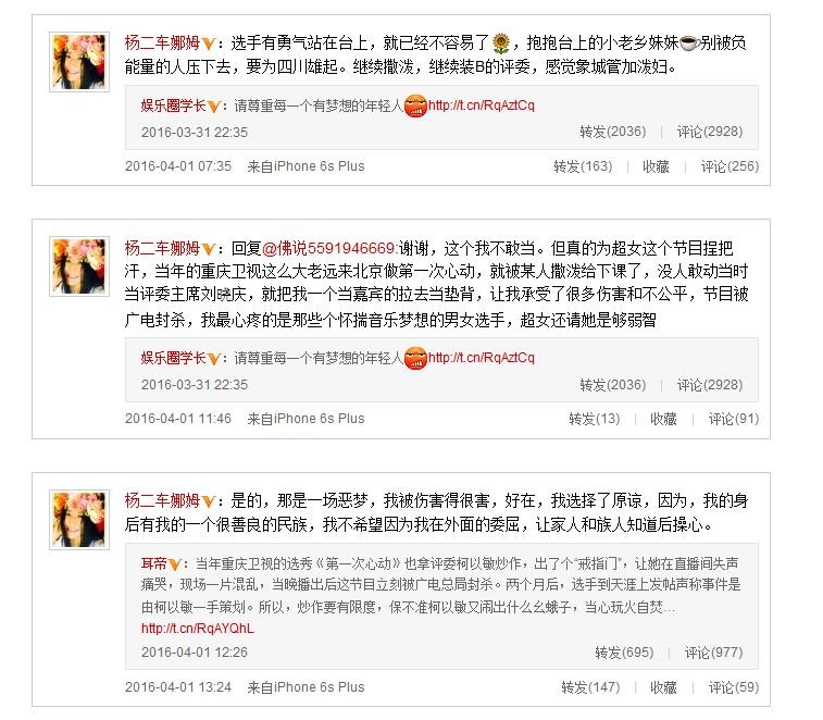 随后,杨二车娜姆再次转发,提到07年的一桩旧事:“当年的重庆卫视这么大老远来北京做第一次心动,就被某人撒泼给下课了,没人敢动当时当评委主席刘晓庆,就把我一个当嘉宾的拉去当垫背,让我承受了很多伤害和不公平,节目被广电封杀,我最心疼的是那些个怀揣音乐梦想的男女选手,超女还请她是够弱智。”