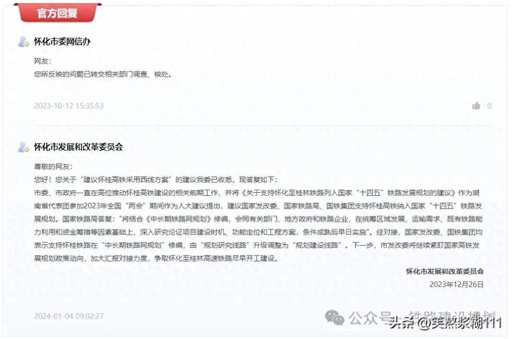 近日,针对网友提出的关于“建议怀桂高铁采用西线方案”的建议,怀化市发改委答复: