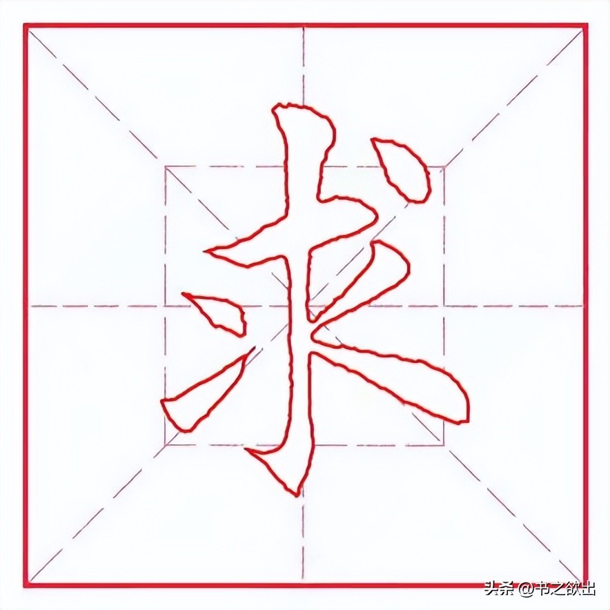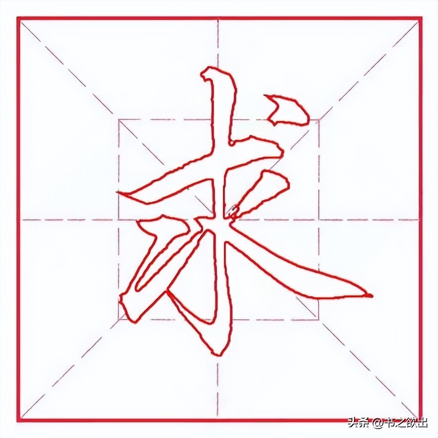 首横以露锋斜切入笔,大抗肩,注意长度;竖笔高起,以平切落笔,稍重,然后转中锋向下直行,竖身稍细,内直外弯,劲挺有力,行笔到位后以跪笔弹锋出钩,内圆外方;左边两个点笔稍偏左,上点略轻、略平,下点左探,出锋指向右上方呼应下画,出锋勿长;撇画起笔位于首横的收笔下方,撇身稍直;反捺舒展,由轻及重,角度略平,且收笔略高于左边的提点;最后点画起笔位于撇画起笔的垂直线上,形态饱满,重心下坠。
