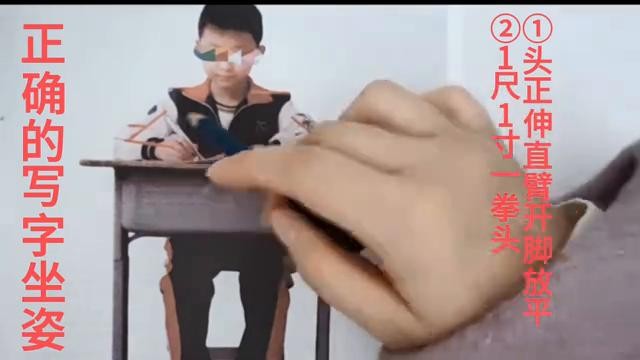 打卡他的眼睛,离眼睛里书本是不是保持了一尺的距离?握笔的手指离笔头有一寸的距离,也就是这样。这是一支铅笔,应该大致在花纹这个地方,手指在花纹的这个地方就可以了。胸口没有紧贴着桌子,而是离桌子有一拳头的距离。