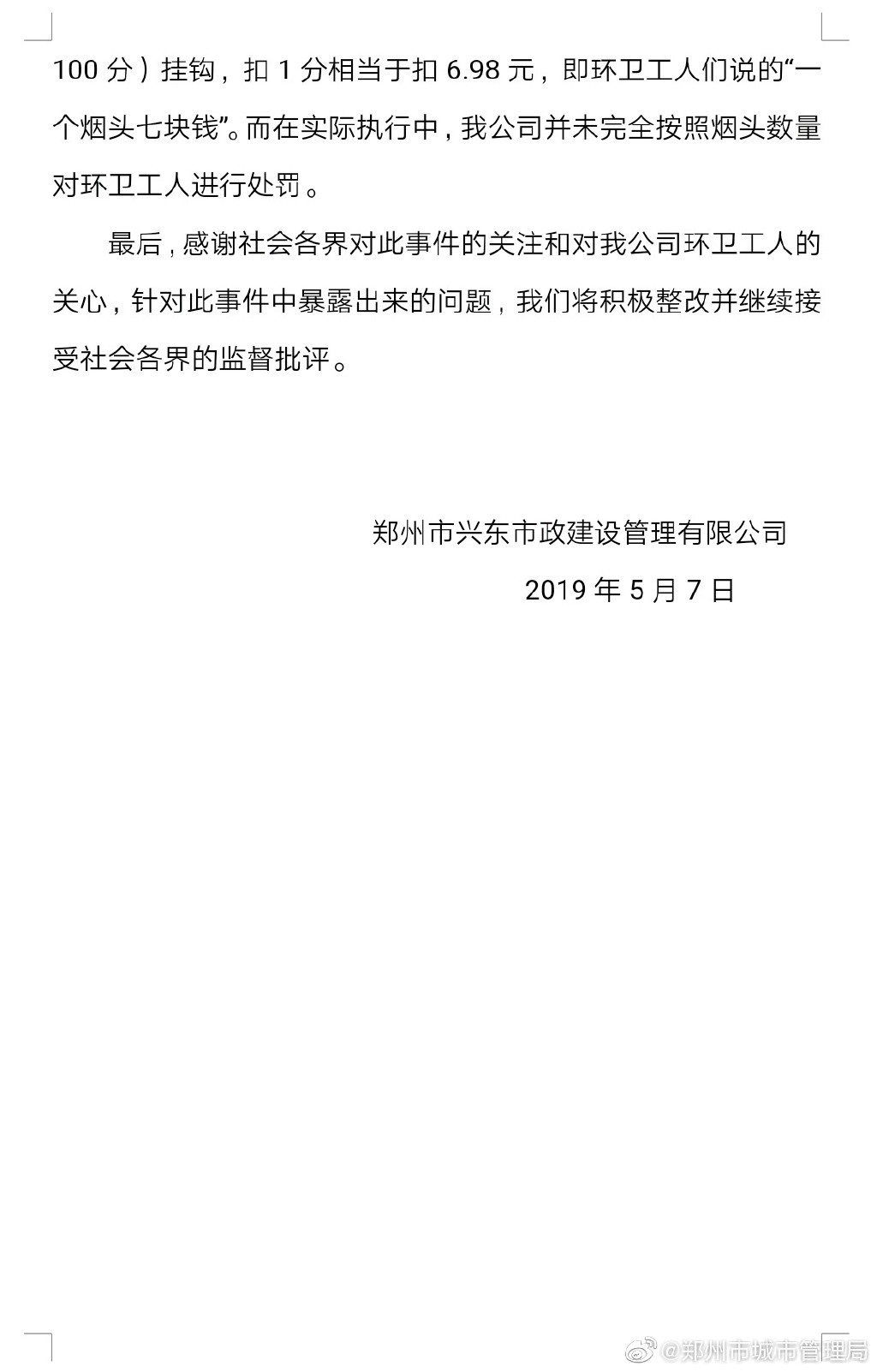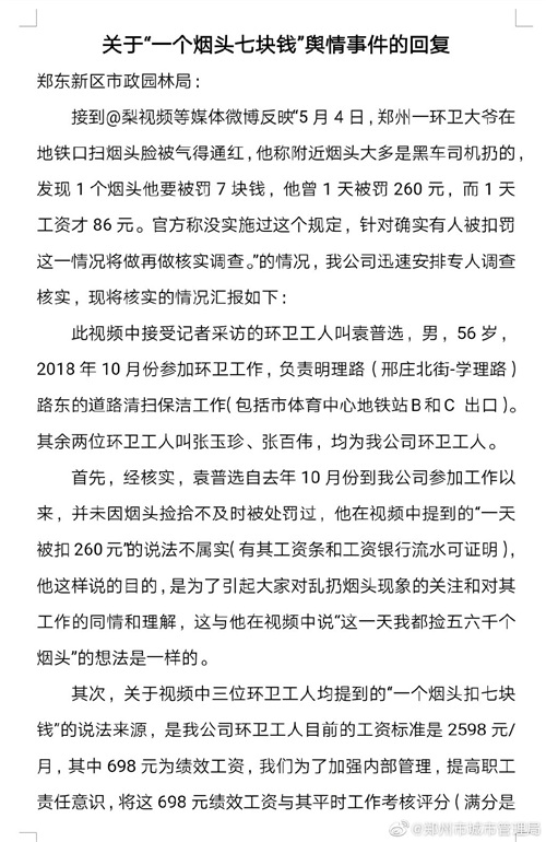 新京报快讯 据郑州市城市管理局官方微博消息,5月7日,郑州市兴东市政建设管理有限公司针对网友近期特别关注的“发现一个烟头扣环卫工人七块钱"的舆情事件的调查回复(见附图)。5月8日,郑州市城市管理局官方微博发布对于该公司的回复,郑州市城市管理局环卫处薛芳礼处长指出郑州市目前执行的环卫职工工资标准2598元/月里面,按规定只能有450元作为绩效工资,且最低发放数额不能少于300元,即扣除部分最多不能超过150元。而该公司将其中698元作为绩效工资属于违规行为,已责令郑东新区市政园林局督促该公司马上整改,并安排各区环卫主管部门核查自己辖区是否存在类似违规情况。