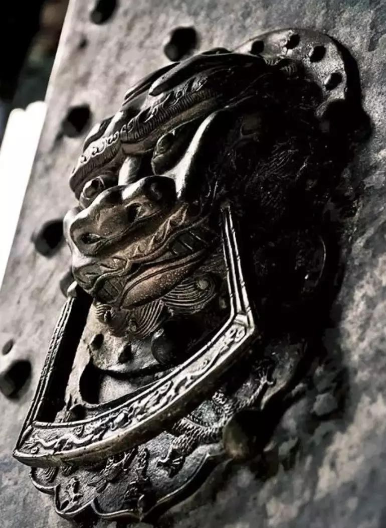 椒图明清以前叫“铺首衔环”,具体浮雕形象是龙狮嘴里含一个圆环,访客可通过敲打圆环叩问主人是否在家。
