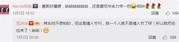 李晨拍照的姿势看起来没有范冰冰表现的自然,有点僵硬,范冰冰回复说:“其实他不想拍的,但这是情人节刊,我一个人就不是情人节了呀,所以就把他拉来了!哈哈!”