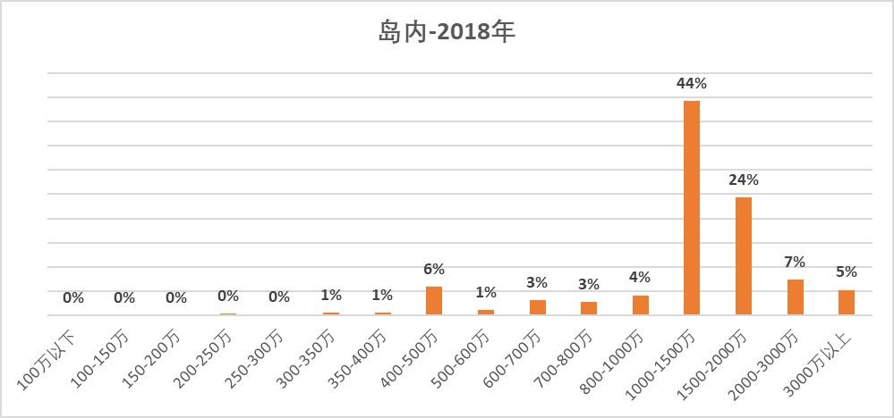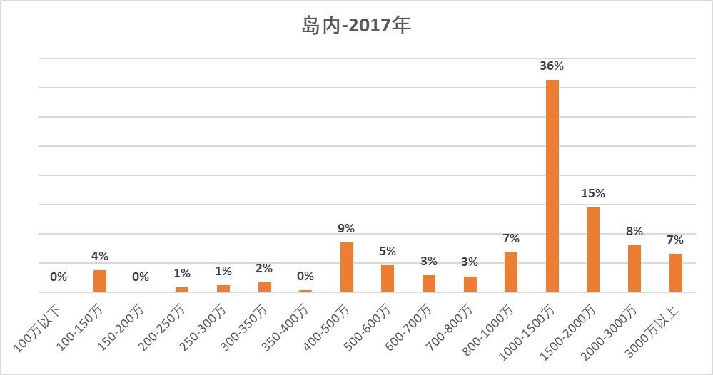 2017年,1000-1500万占比独占36%,主要是万科湖心岛、华尔顿1275成交。1000万以内的不多了。