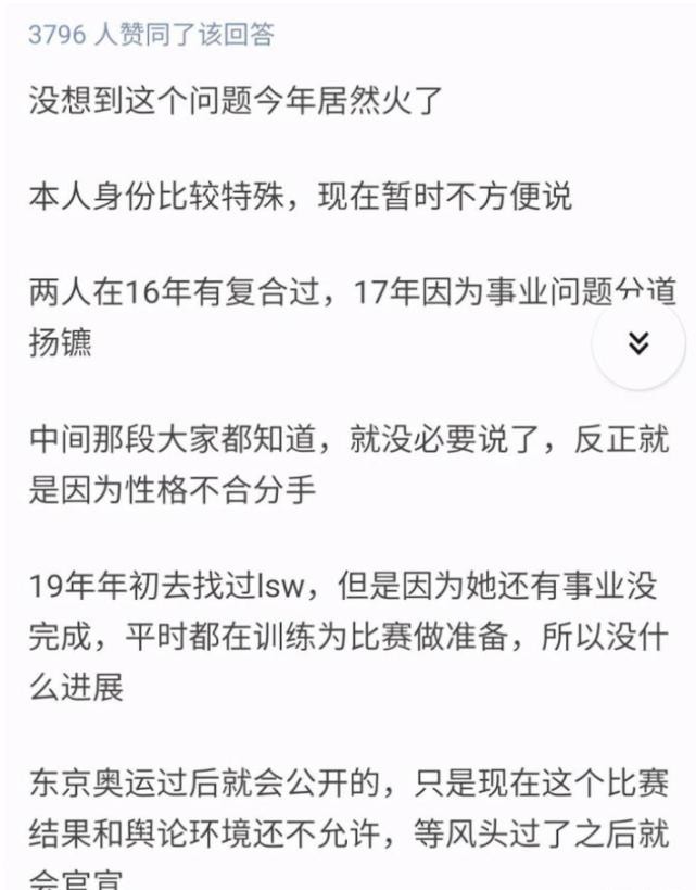 爆料中还声称两人其实早就复合了,16年复合过一次,后来又分开,现在又复合了,只是刘诗雯已经明确表示过自己不会再参加3年后的巴黎奥运会,也就意味着刘诗雯会退出大家的视线,等这段风头过去了,就会官宣!