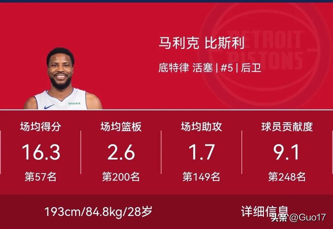 比斯利本赛季为活塞队效力,出战了全部82场常规赛比赛,展现出了稳定的表现。他场均贡献16.3分、2.6篮板和1.7助攻,