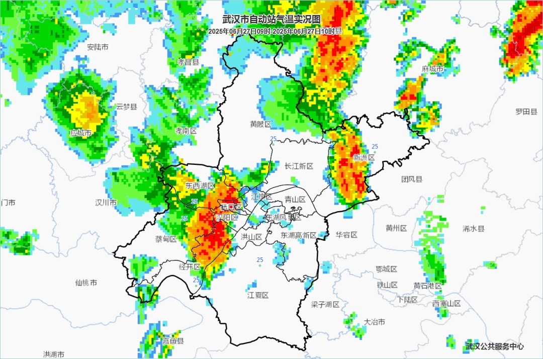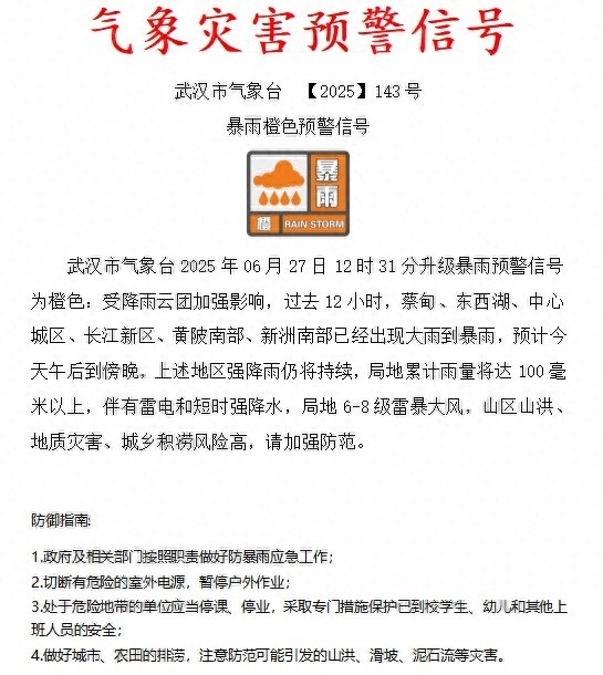 受降雨云团加强影响,过去12小时,蔡甸、东西湖、中心城区、长江新区、黄陂南部、新洲南部已经出现大雨到暴雨,预计今天午后到傍晚,上述地区强降雨仍将持续,局地累计雨量将达100毫米以上,伴有雷电和短时强降水,局地6-8级雷暴大风,山区山洪、地质灾害、城乡积涝风险高,请加强防范。